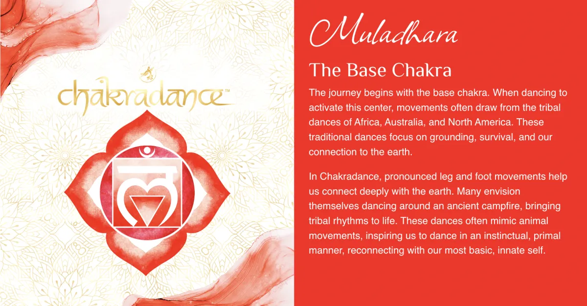 In Chakradance™ each chakra is associated with a unique dance that helps to activate and balance its energy. These dances draw on ancient traditions and movements from around the world, allowing you to connect deeply with your primal instincts, emotions, inner power, love, truth, intuition, and spirituality.