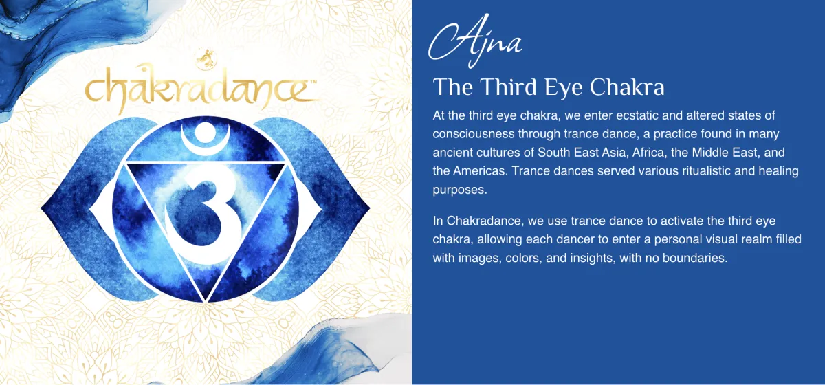 In Chakradance, we use trance dance to activate the third eye chakra, allowing each dancer to enter a personal visual realm filled with images, colors, and insights, with no boundaries.