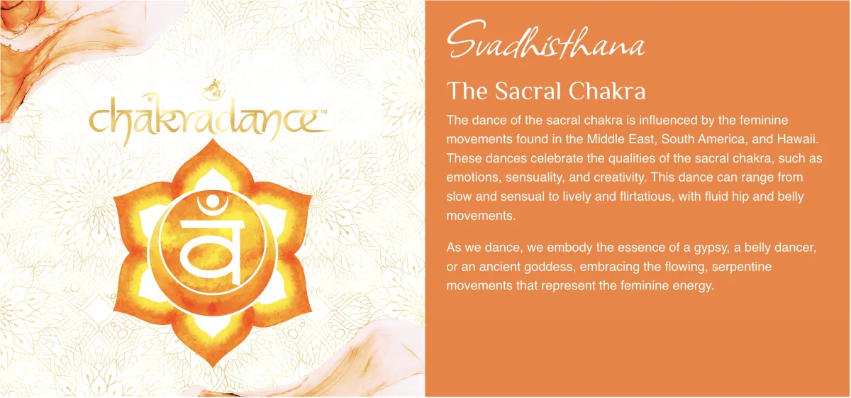 The dance of the sacral chakra is influenced by the feminine movements found in the Middle East, South America, and Hawaii. These dances celebrate the qualities of the sacral chakra, such as emotions, sensuality, and creativity. This dance can range from slow and sensual to lively and flirtatious, with fluid hip and belly movements.