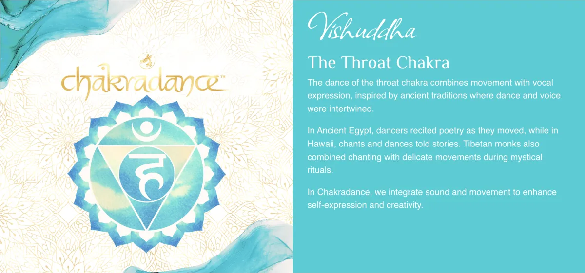The dance of the throat chakra combines movement with vocal expression, inspired by ancient traditions where dance and voice were intertwined.